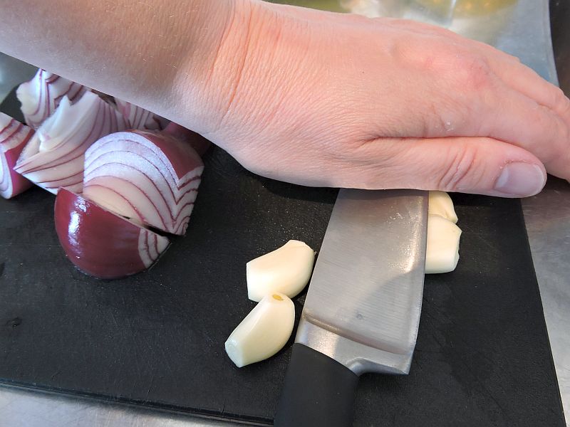 Skala rödlöken och skär den i klyftor – spara en lite större bit.