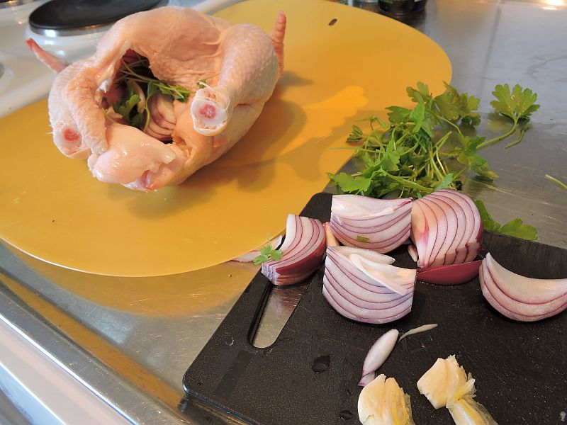 Fyll kycklingen med persilja, rödlök och vitlök. Allra sist petar du in den där lite större biten rödlök som du har sparat, den kommer hjälpa till att hålla saker och ting på plats, så att säga.