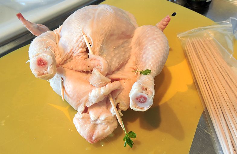 Fäst ihop kycklingskinnet med hjälp av tandpetare eller smala grillspett i trä (cocktailpinnar funkar också fin-fint). Det är en extra försäkran mot att kycklingen helt plötsligt pruttar ur sig lök och persilja i ett olämpligt ögonblick.