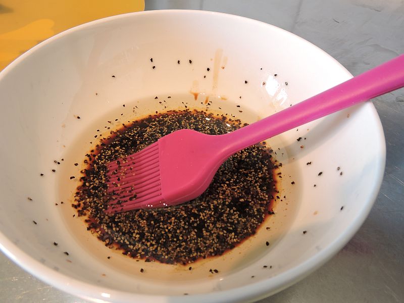 Blanda den första mängden rapsolja med soja och svartpeppar i en skål.