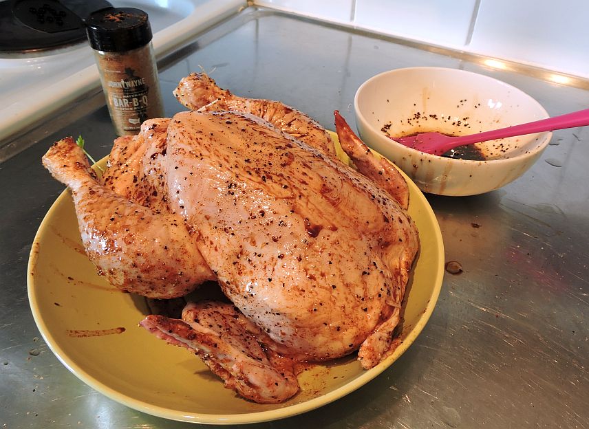 Pensla överallt som du kommer åt på kycklingen med oljeblandningen. Det enklaste är att ta en sida i taget.