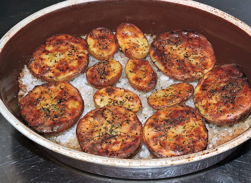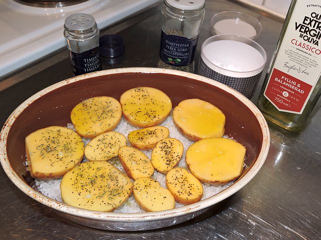 Smörj en vid ugnsfast form med olivolja.Täck botten av formen med ett lager grovsalt som är tillräckligt tjockt för att du ska kunna ställa potatishalvorna i det.
