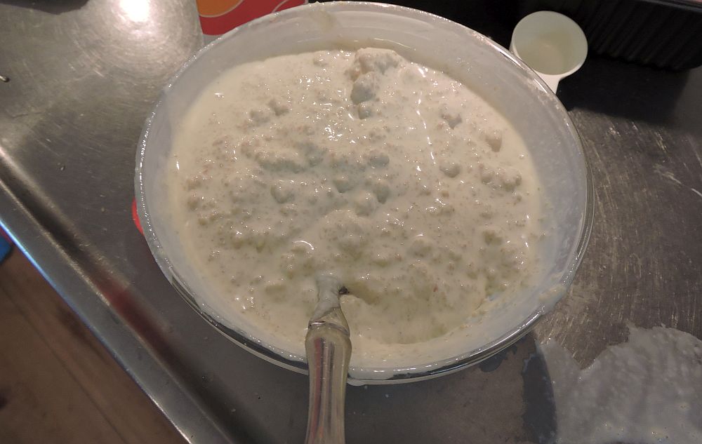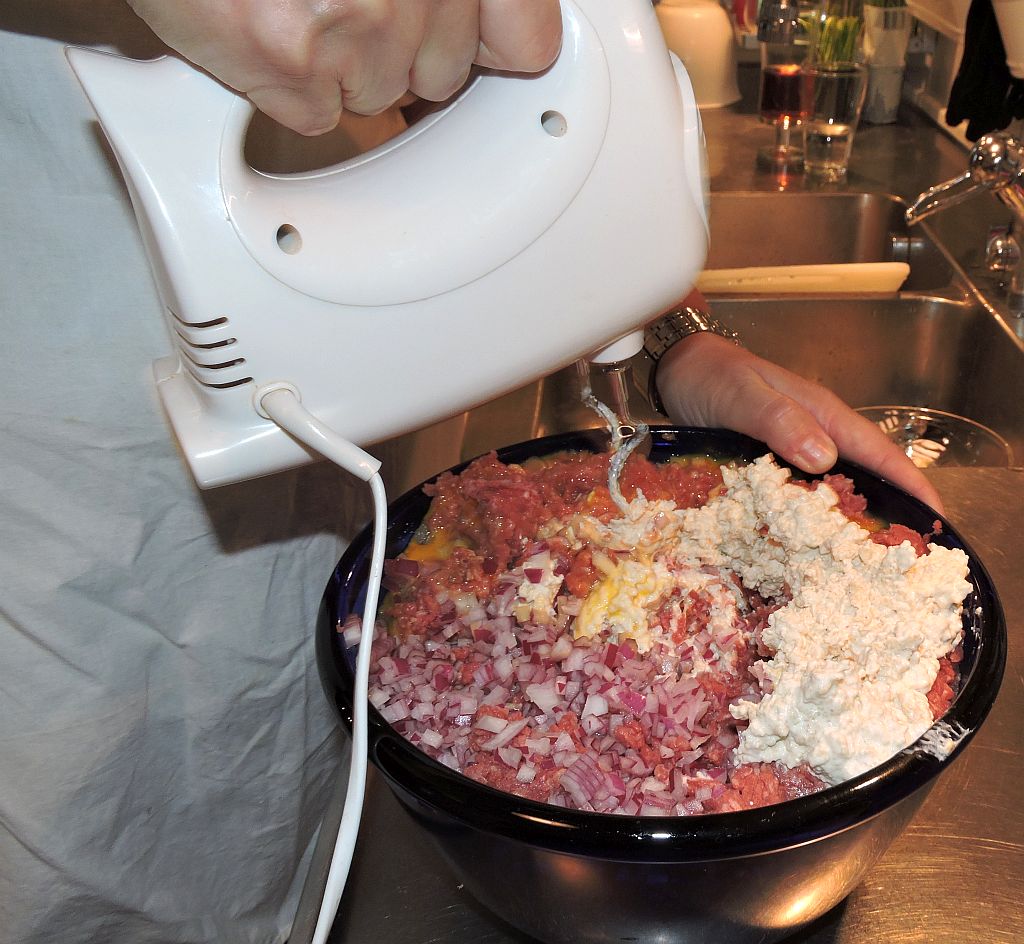 Har du en elvisp så montera degkrokarna på den och använd för att blanda ihop färsen. Annars får du blanda för hand med en trägaffel så gott du kan.
