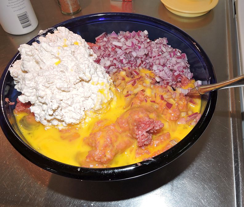 Häll köttfärsen i en stor bunke och tillsätt rödlök, ägg och ströbröd-och-grädd-blandningen.