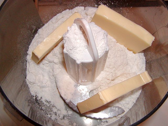 Montera kniven på din hushållsassistent. Häll mjöl i blandningsskålen och tillsätt smöret skuret i bitar.