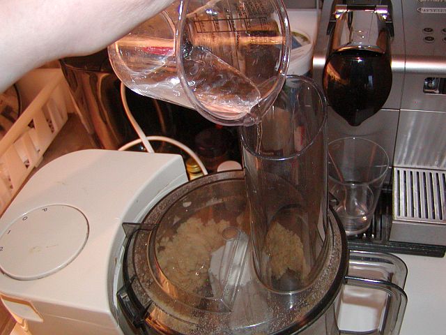 Sätt på locket och kör assistenten på hög hastighet tills smöret har finfördelats i mjölet. Sänk hastigheten något och häll vattnet genom röret i assistentens lock.