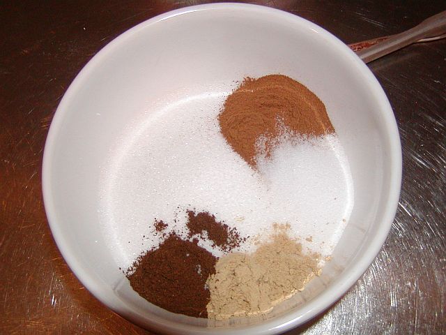 Blanda strösocker, salt, kanel, ingefära och nejlikor i en liten skål.
