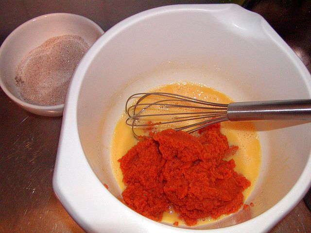 Knäck äggen i en större bunke och vispa ihop dem. Tillsätt pumpapurén och socker-och-kryddblandningen och blanda väl.