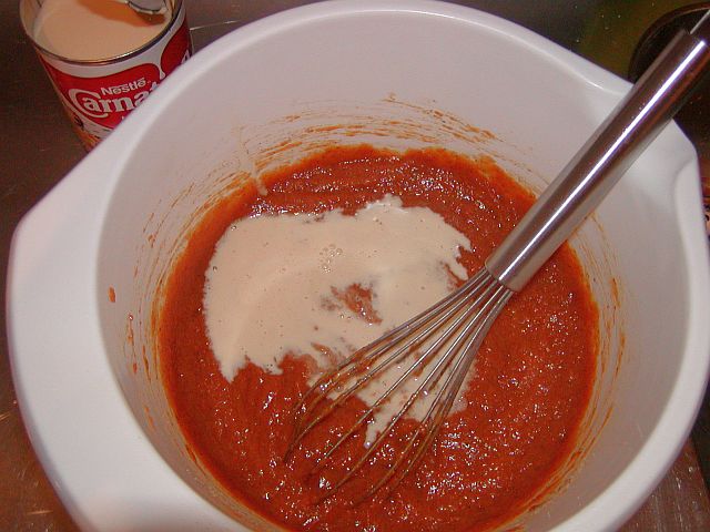 Tillsätt ångpreparerad mjölk lite i taget. Vispa noga ut mjölken i pumpablandningen innan du tillsätter nästa skvätt.