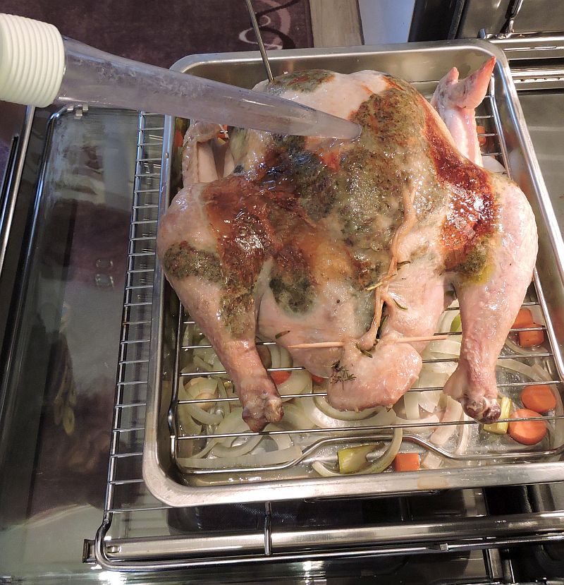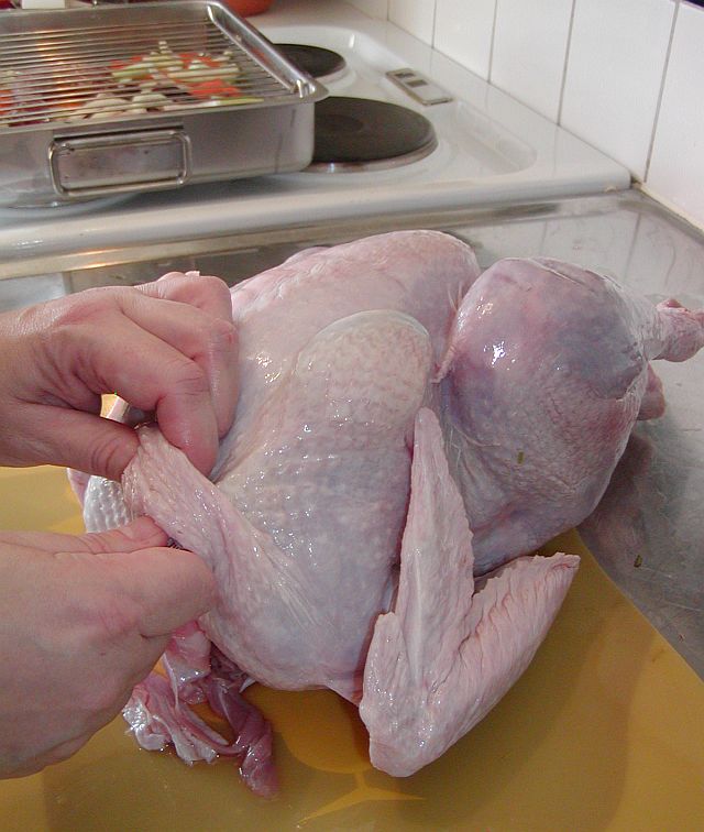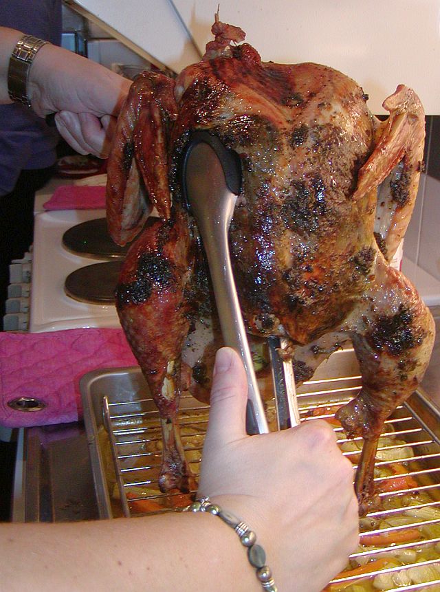 När kalkonen till slut är färdig så ta ut den och formen ur ugnen. Ta bort cocktailpinnarna eller tandpetarna och sätt en stekgaffel eller stor mat-tång i kalkonens hålrum. Lyft och tippa den försiktigt över formen så att saften från kalkonens inre rinner ut över grönsakerna.