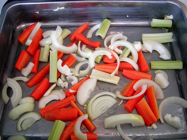 Skala lök och morötter och skiva dem grovt. Skölj sellerin och skär den i bitar. Sprid ut de hackade grönsakerna i botten av den smorda formen. Slå på cirka 1 dl kallt vatten.