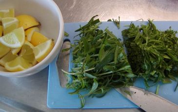 Borsta citronen och skär den i bitar. Skölj rosmarinen och hacka grovt tillsammans med de överblivna stjälkarna från kryddsmöret.