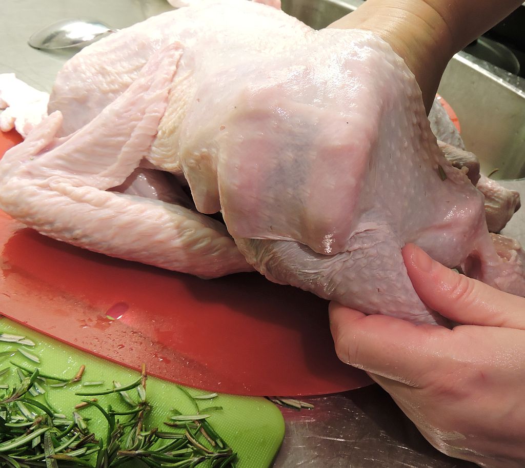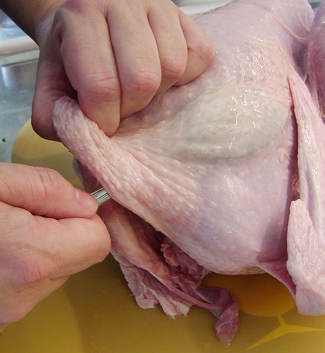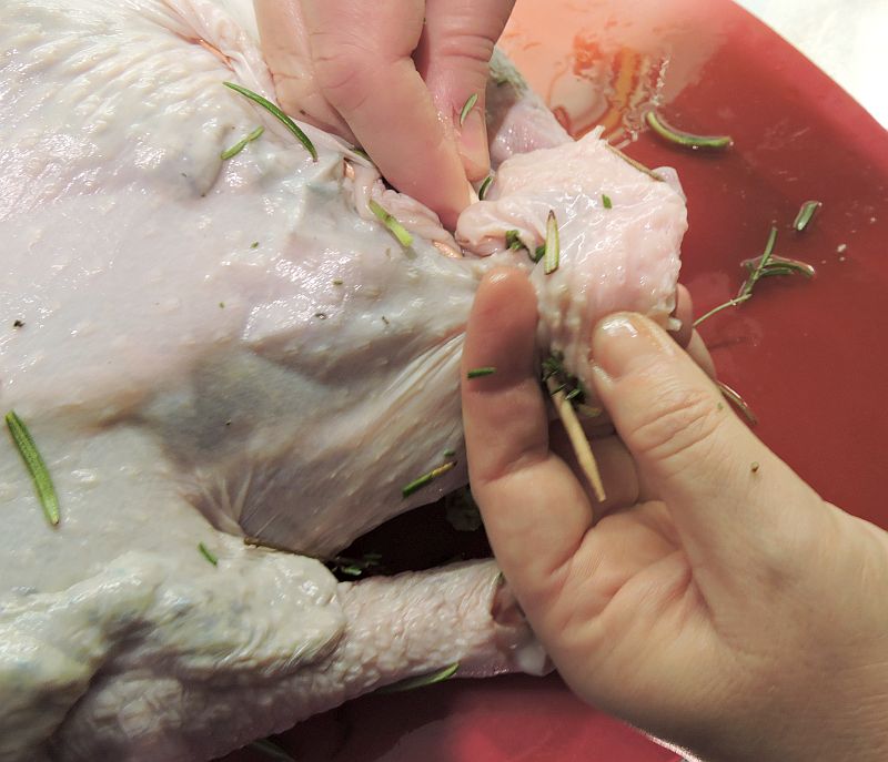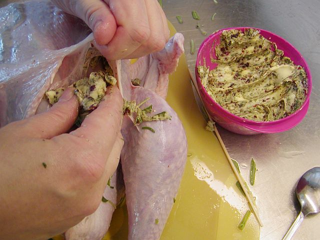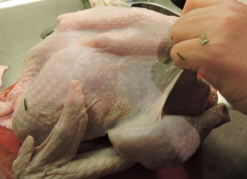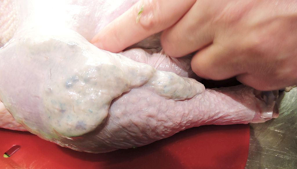 Ta en trubbig matsked och för in den mellan kalkonens skinn och köttet. Börja på sidan precis ovanför öppningen som du just fyllt med kryddörter och citron. Arbeta dig försiktigt upp mot bröstbenet och ryggen så att det blir en stor ficka mellan skinn och kött.