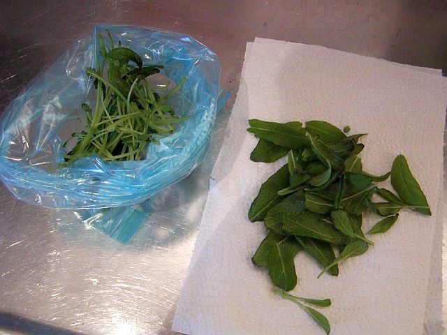 Plocka själva örterna från stjälkarna. Lägg stjälkarna i en plastpåse som du lägger i kylskåp – dem ska du använda dagen efter för att fylla kalkonen.