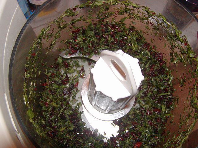 Montera kniven i matberedaren. Lägg kryddörterna och tranbären i blandningsskålen.