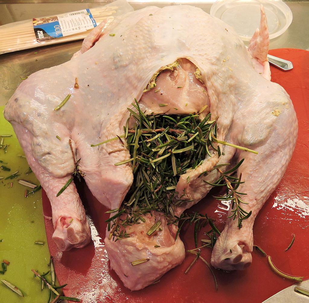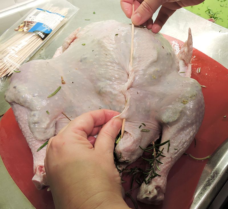 Använd cocktailpinnar eller tandpetare för att ”nåla ihop” öppningen så att fyllningen inte faller ut under tiden kalkonen tillagas. Du kan också gärna slå en knut på kalkonens lösa halsskinn.