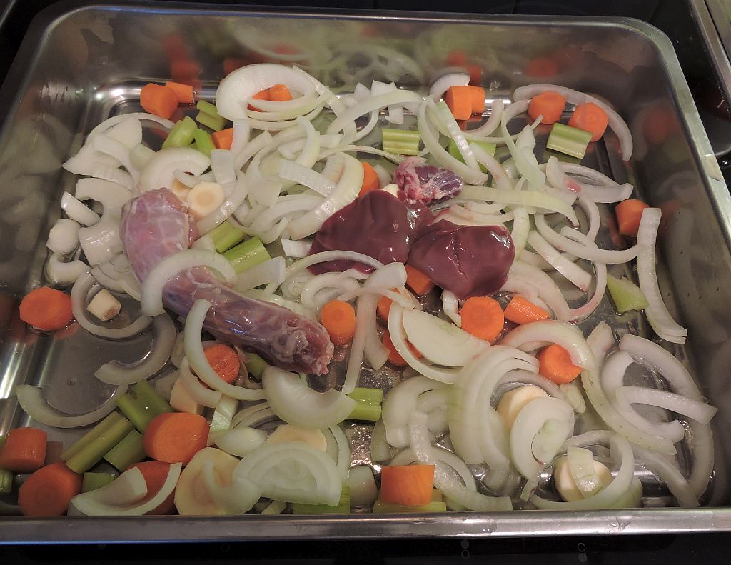 Ta ut kalkonen ur emballaget. Inne i kalkonen ligger troligen en liten påse med hals och inälvor – ta ur den ur kalkonen. Klipp upp påsen, skölj organen i kallt vatten och lägg dem ovanpå grönsakerna i den smorda formen.