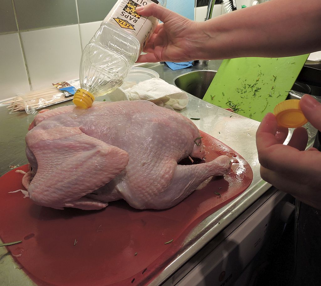 Om kalkonen känns fuktig så torka den gärna en gång till med hushållspapper. Lägg sedan kalkonen på bröstet och häll rapsolja över den. Gnid in ordentligt med händerna innan du vänder på kalkonen och gör samma sak med bröstsidan.