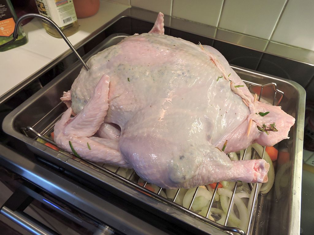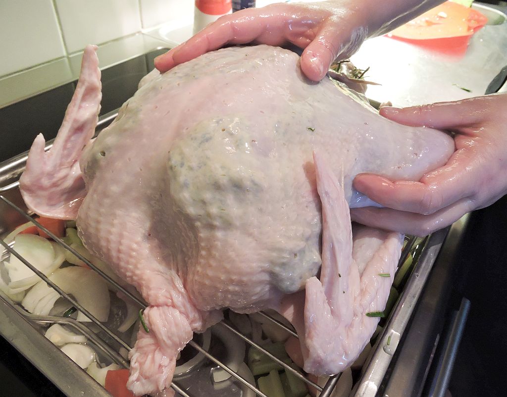 1 dag innan: gör kryddsmöret (se nedan). Kolla att kalkonen är tinad – om inte, lägg den i kallt vatten att tina.