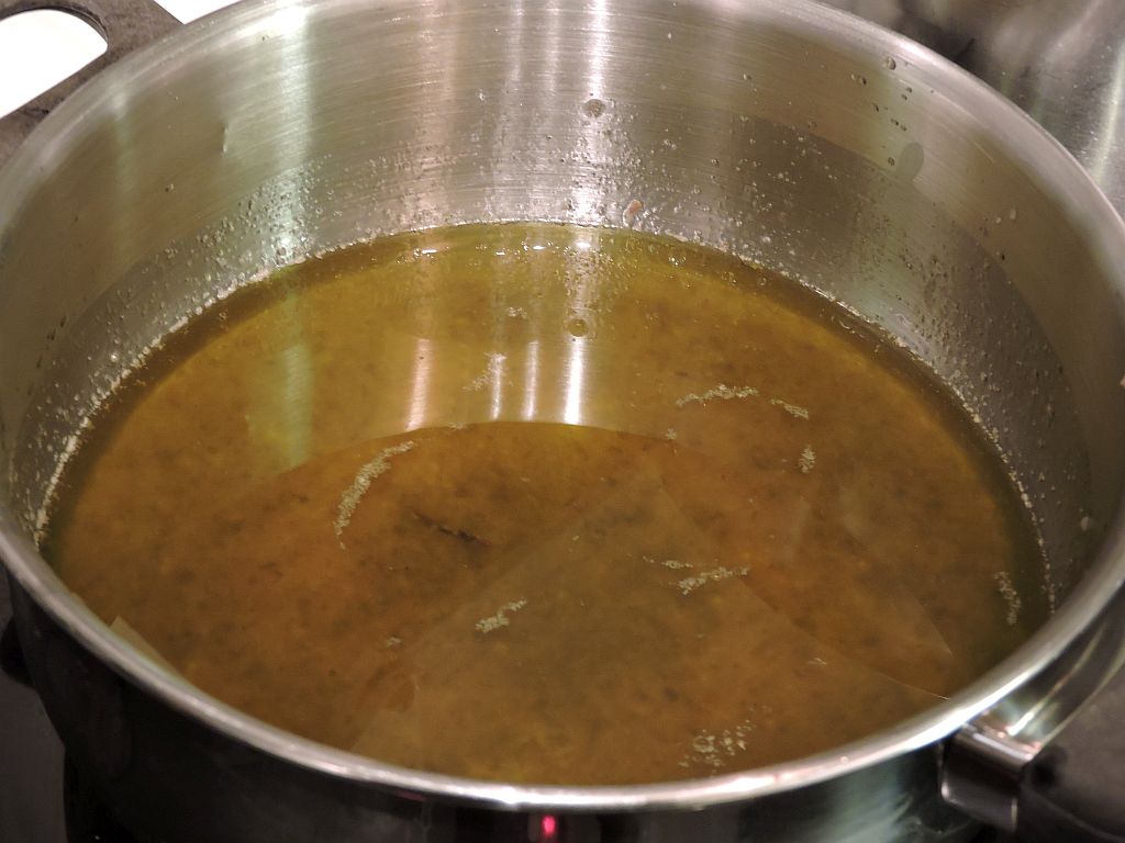 Sila därefter innehållet i formen ner i en vid kastrull eller traktörpanna. Den silade skyn är basen för din sås.