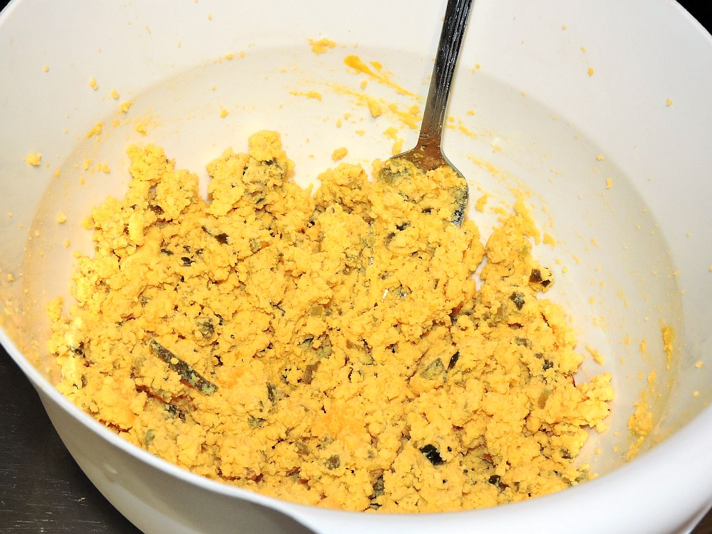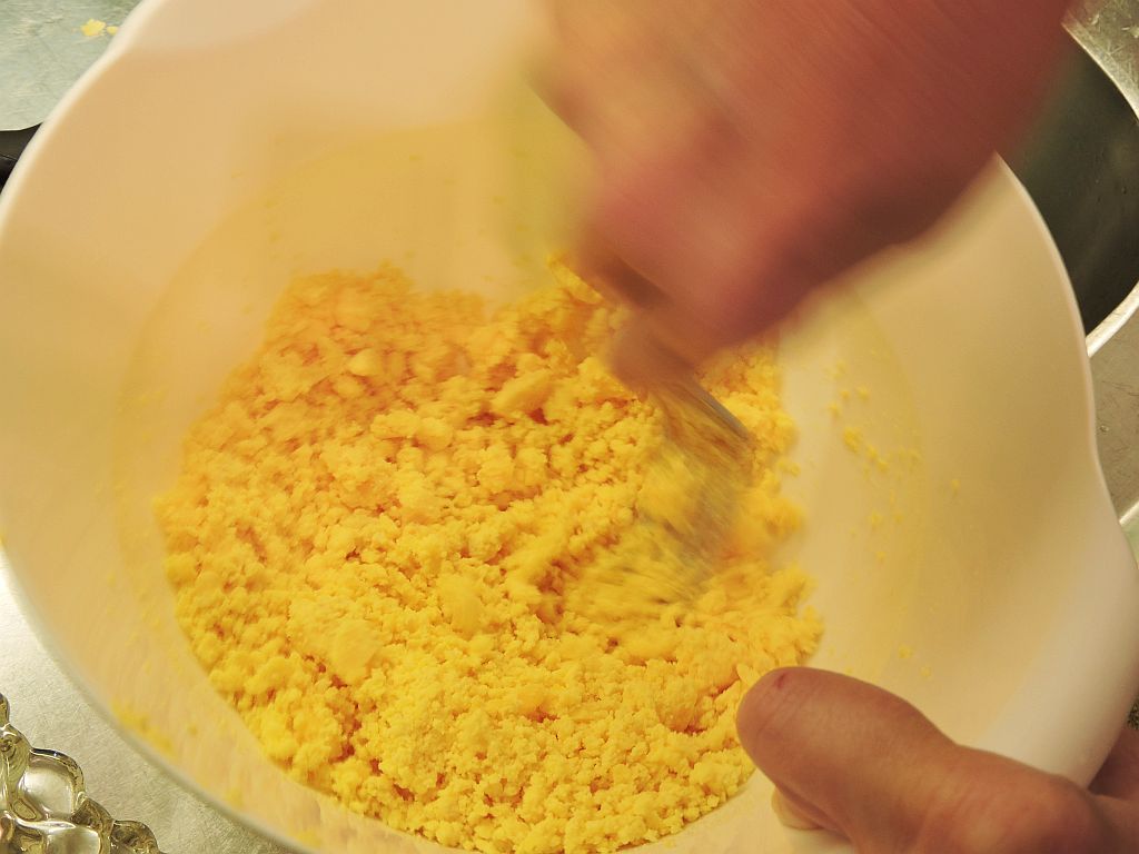 Med en gaffel finfördelar du äggulorna tills de är riktigt söndersmulade.