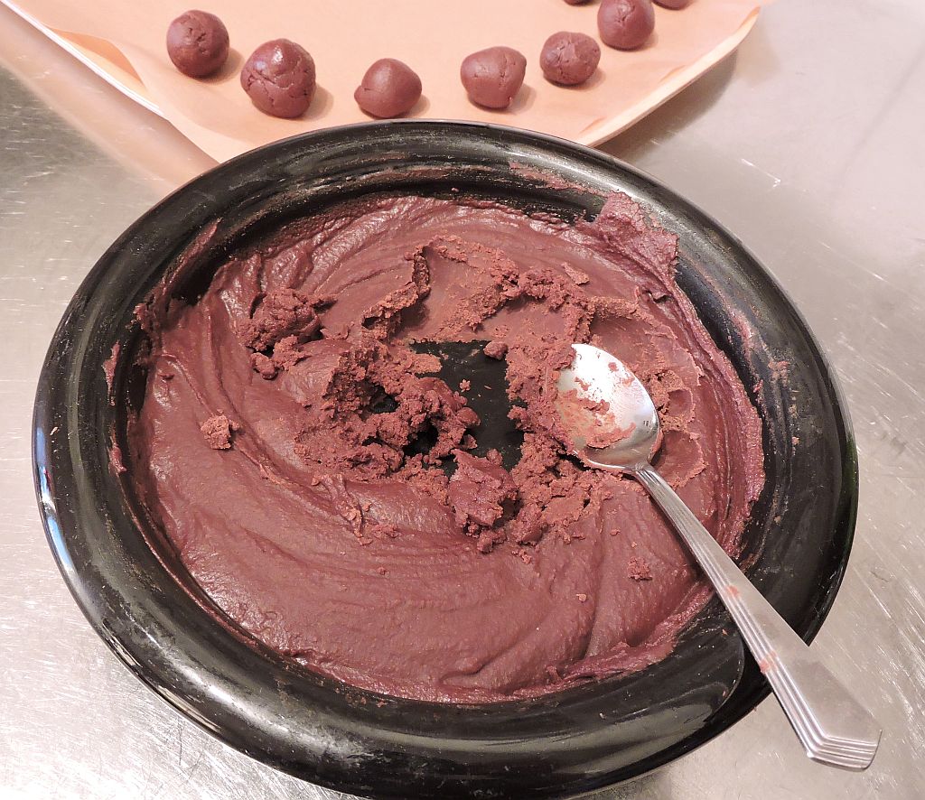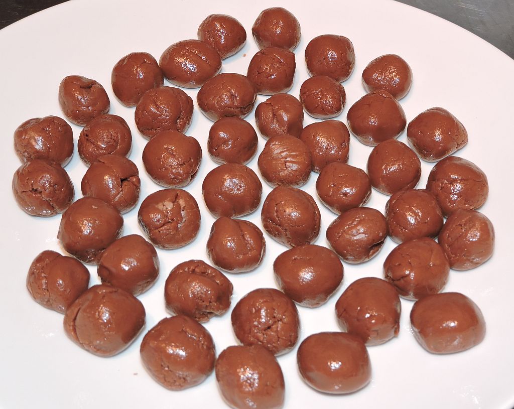 Använd en tesked för att skopa upp en lagom mängd stelnad tryffelsmet. Rulla den sedan mellan rena händer och lägg på en bricka täckt med bakplåtspapper. Eller direkt på en flat tallrik.