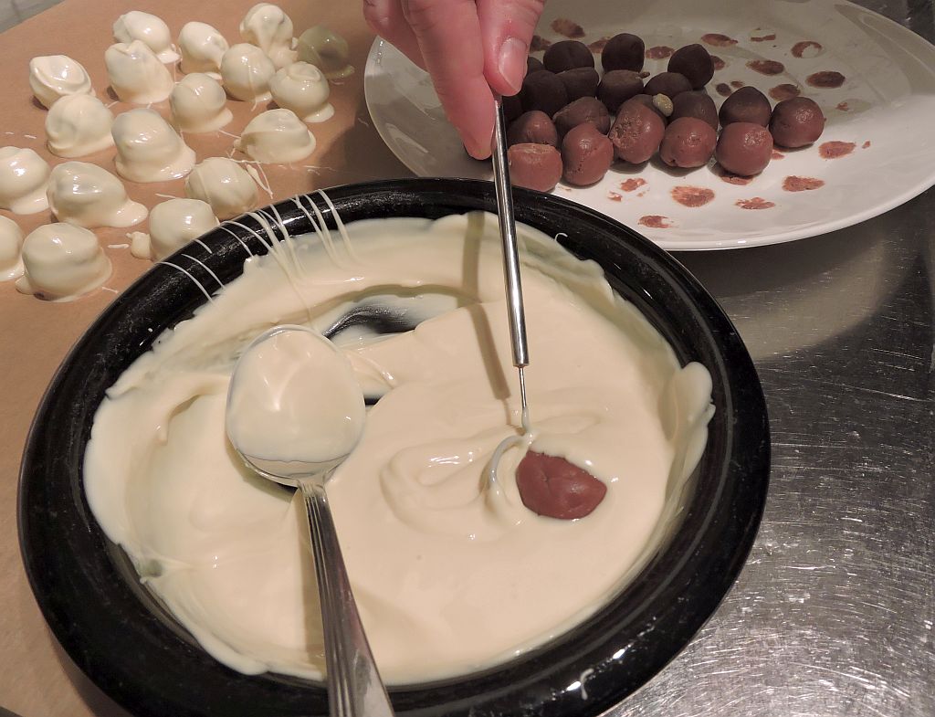 Snurra runt tryffeln så den blir täckt med choklad överallt. Det är viktigt att du är ganska snabb, så att tryffeln inte hinner börja smälta innan du får upp den ur chokladen igen.