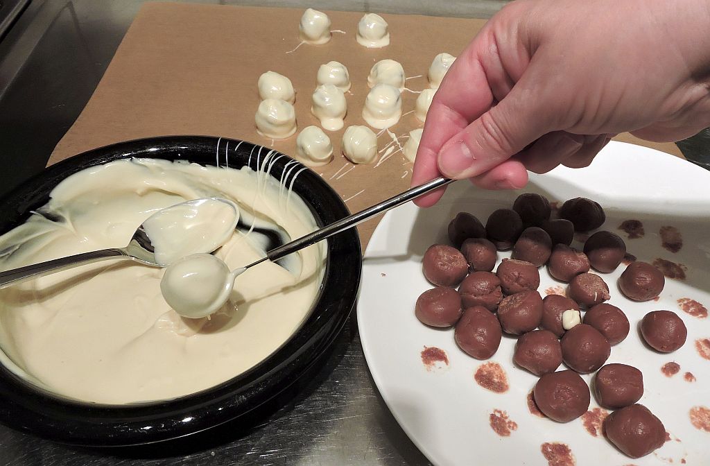 När du har använt upp all tryffelsmeten så ställ tallriken i kylskåp i minst 2 timmar för den mörka tryffeln med whiskey. Den ljusa tryffeln med Bailey’s behöver minst 3 timmar för att stelna ordentligt innan du doppar dem i choklad.