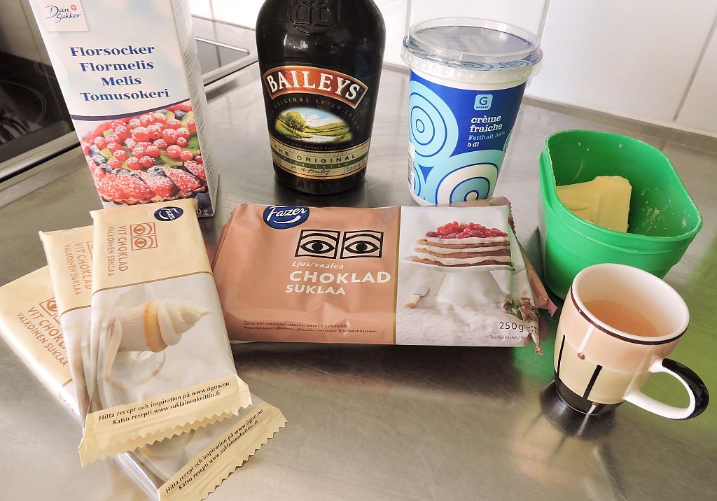 Det är bra att alla ingredienser är rumstempererade när du ska använda dem (mer om det längre fram). Så ta fram och mät upp mängden smör, crême fraiche och Bailey’s i god tid innan du ska börja göra tryfflarna. Häll gärna Bailey’s i kaffet, så blandas den lättare med chokladen.