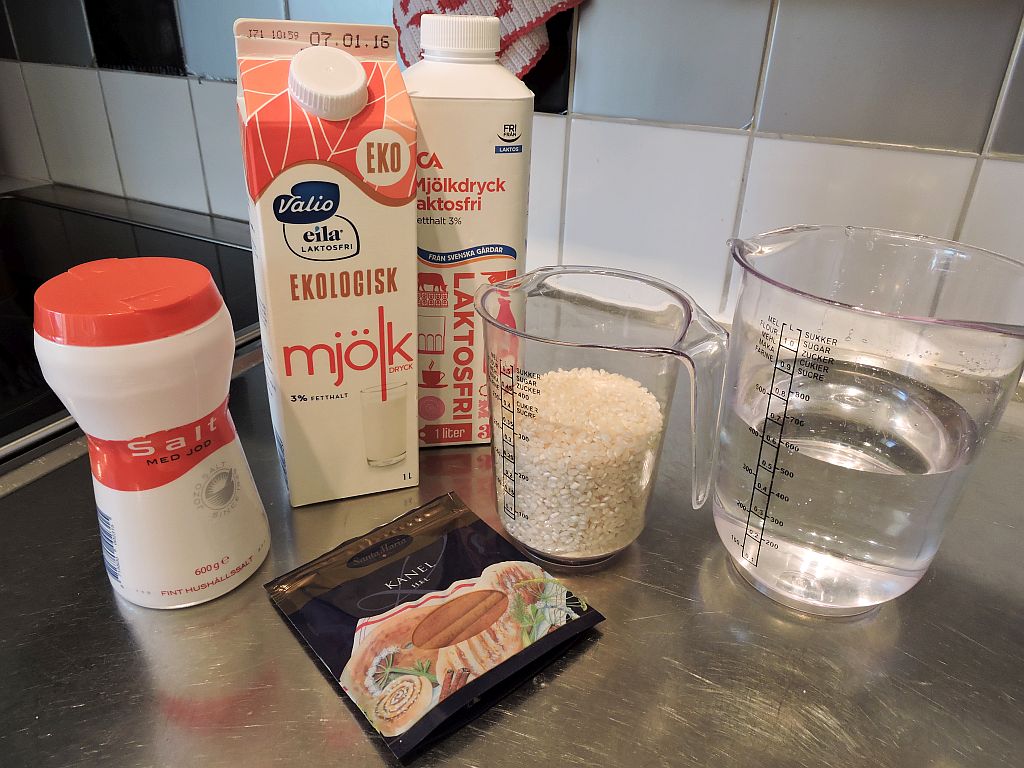 Häll riset i en rymlig kastrull, gärna med teflonbotten. Tillsätt salt och kanelstänger. Häll på vatten och rör om.