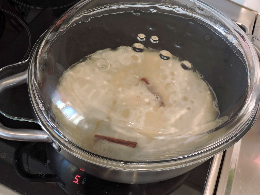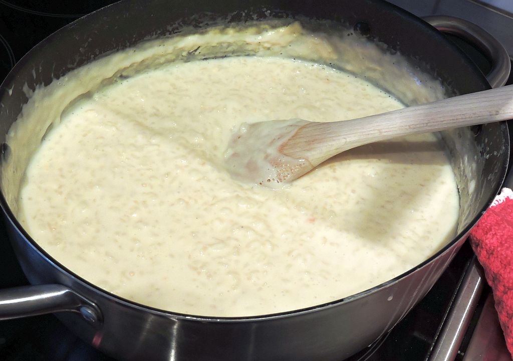 När mjölken har kokat upp, sätt ner värmen så att gröten bara sjuder sakta. Tanken är att riset ska svälla, men inte koka sönder. Låt gröten sjuda i 40 minuter. Under tiden ska du inte röra i gröten.