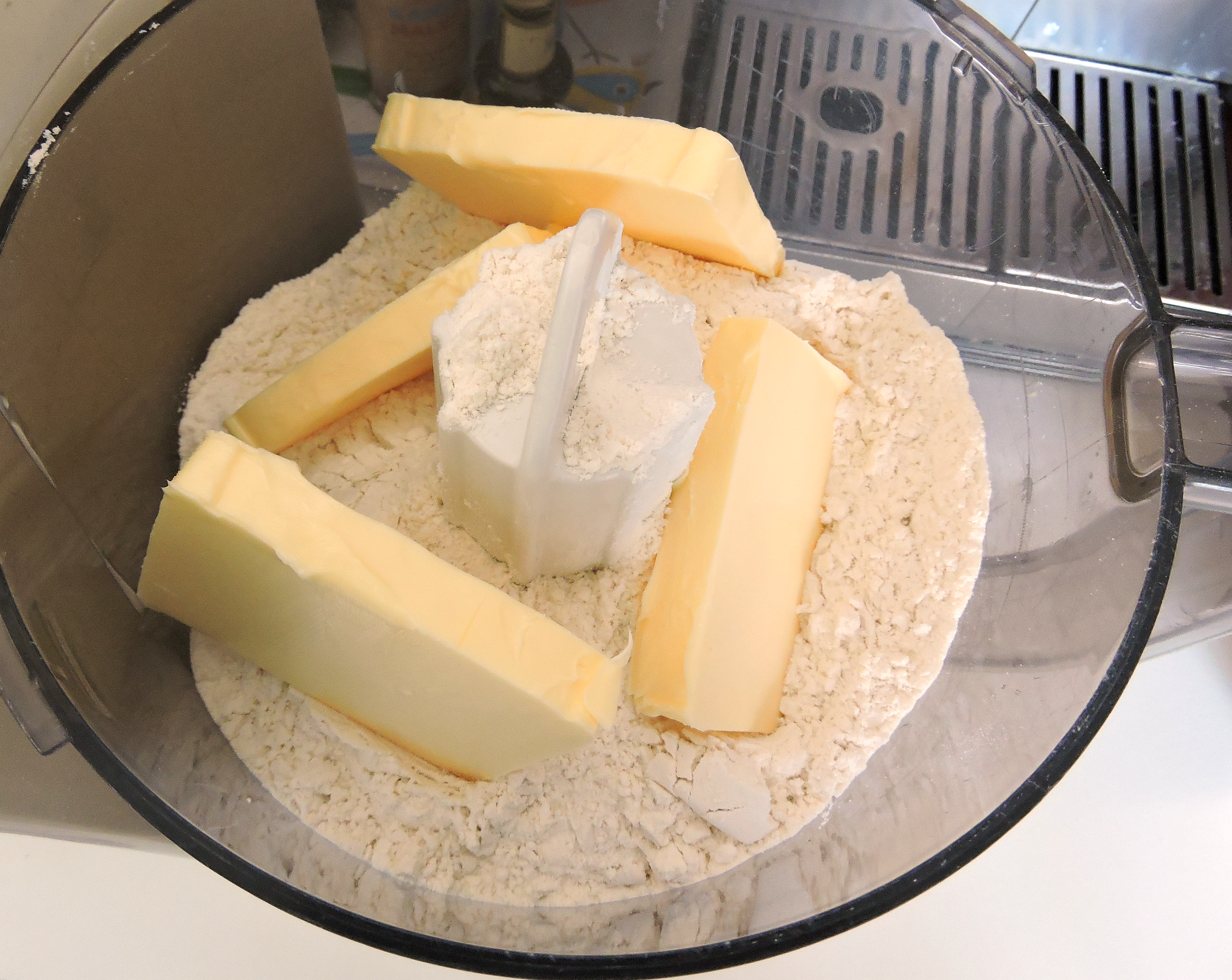 Lägg mjölet i matberedarens blandningsskål. Tillsätt smöret i bitar eller skivor.