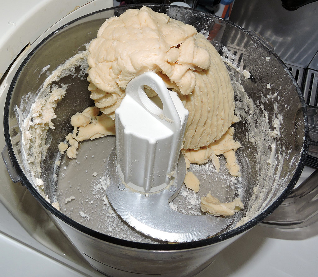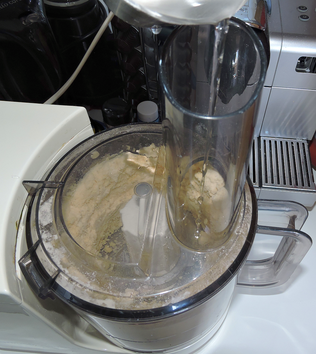 Sätt på matberedarens lock och kör på hög hastighet tills smöret är finfördelat i mjölet. Sänk hastigheten något och genom röret i matberedarens lock häller du vattnet.
