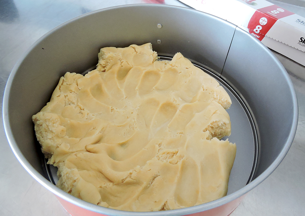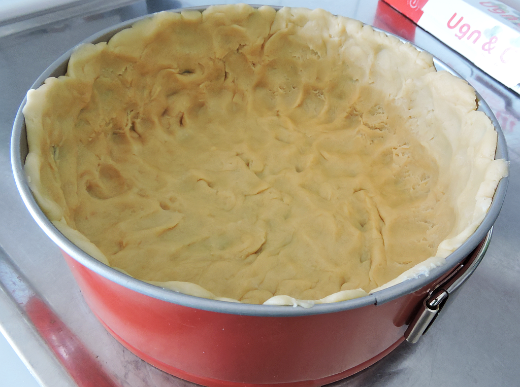 Sätt ugnen på 180°C för varmluft (200°C för vanlig ugn). När degen har vilat färdigt så tryck ut den i en form med löstagbar kant – smörj inte formen.