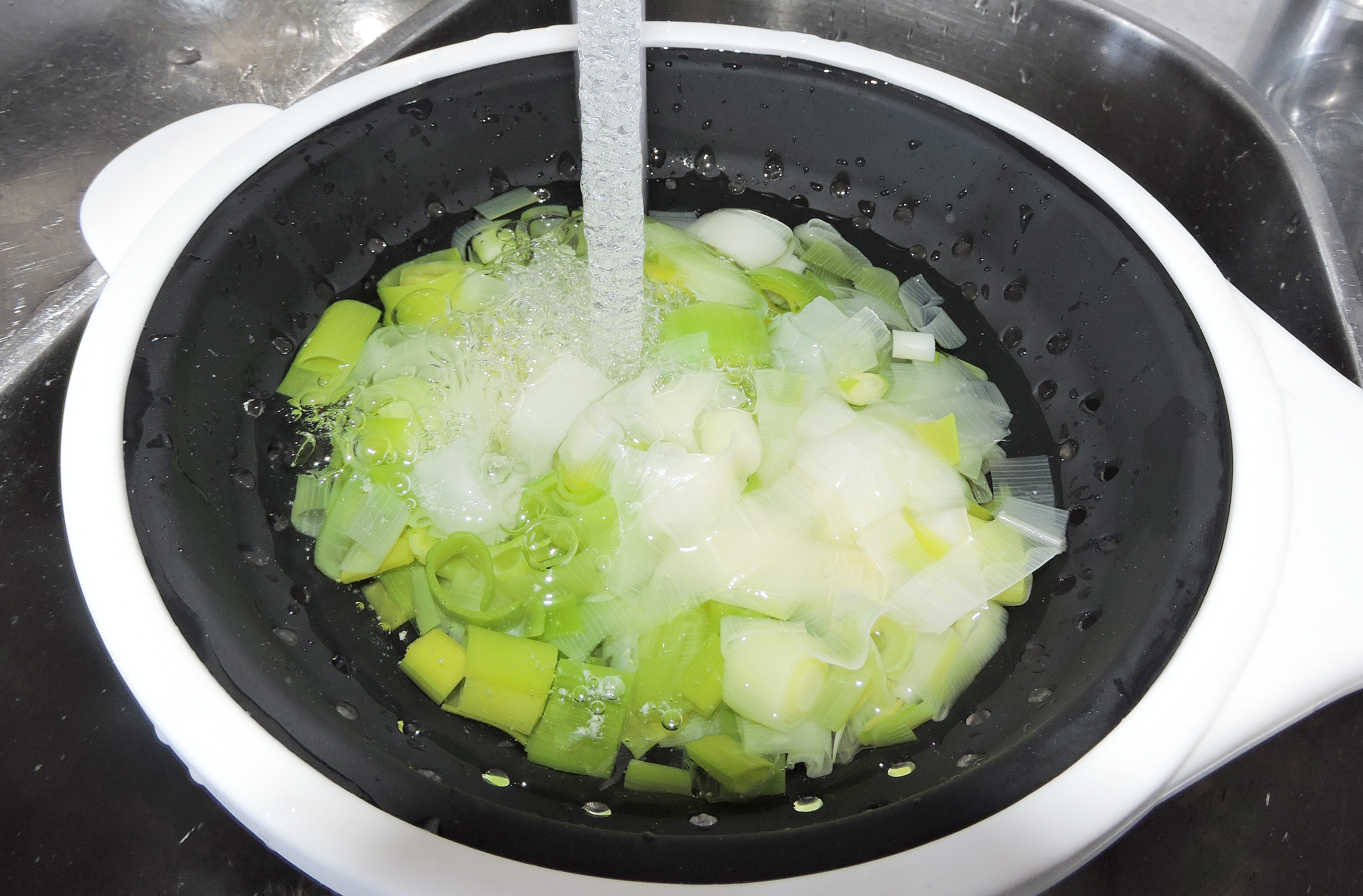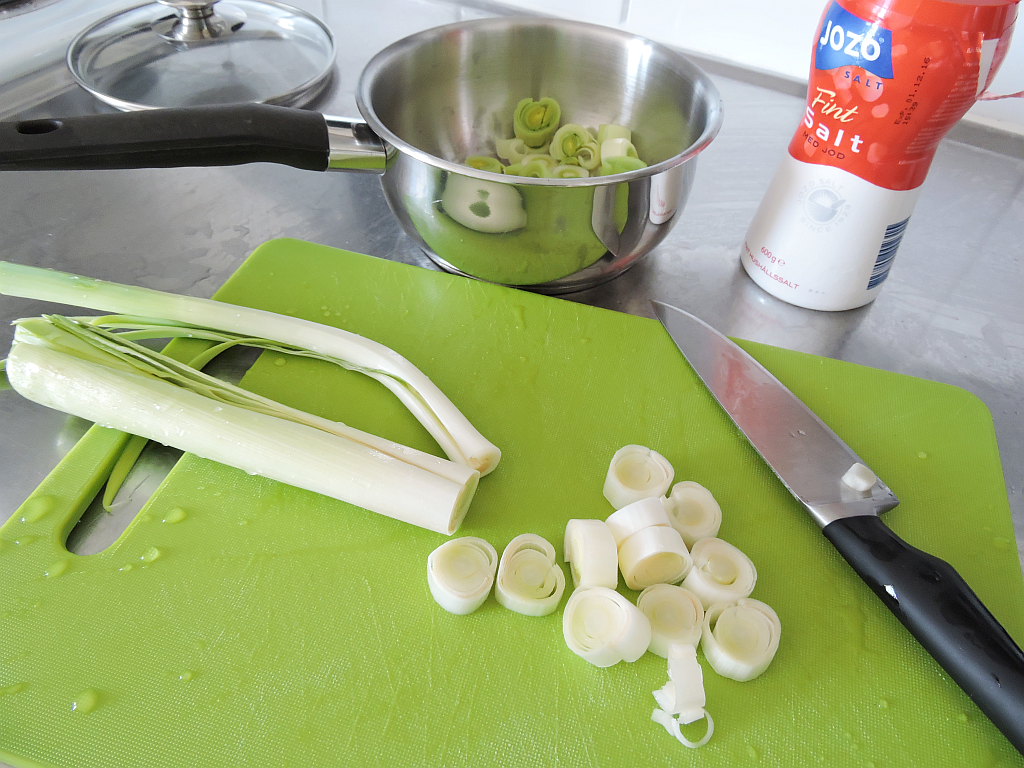 Under tiden rensar du purjolöken och skär den sedan i cirka 1 cm tjocka skivor. Lägg i en kastrull och häll på kallt vatten så att det precis täcker purjolöken.