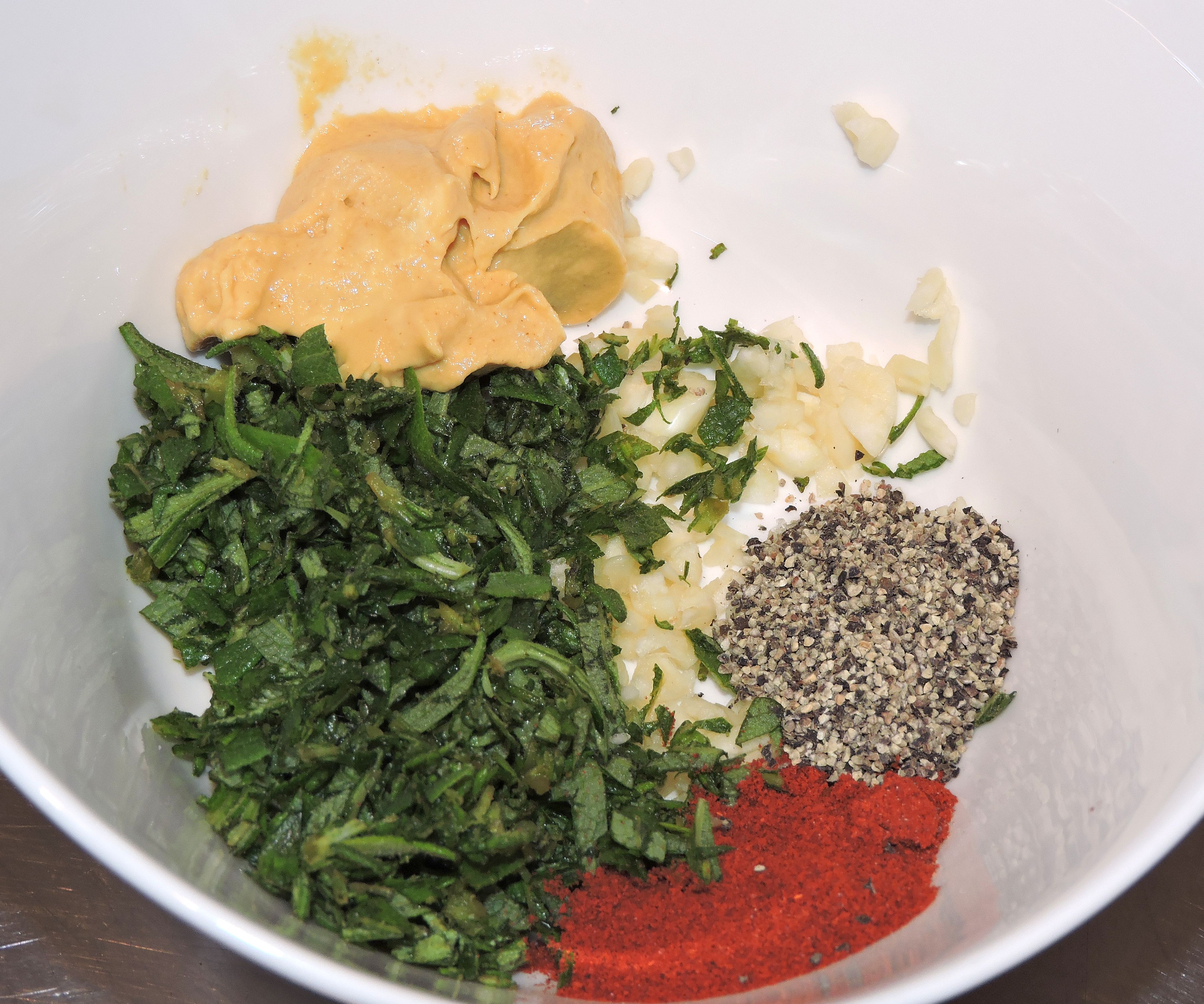 Skala och finhacka vitlöksklyftorna. Lägg dem i en skål tillsammans med den hackade rosmarinen.