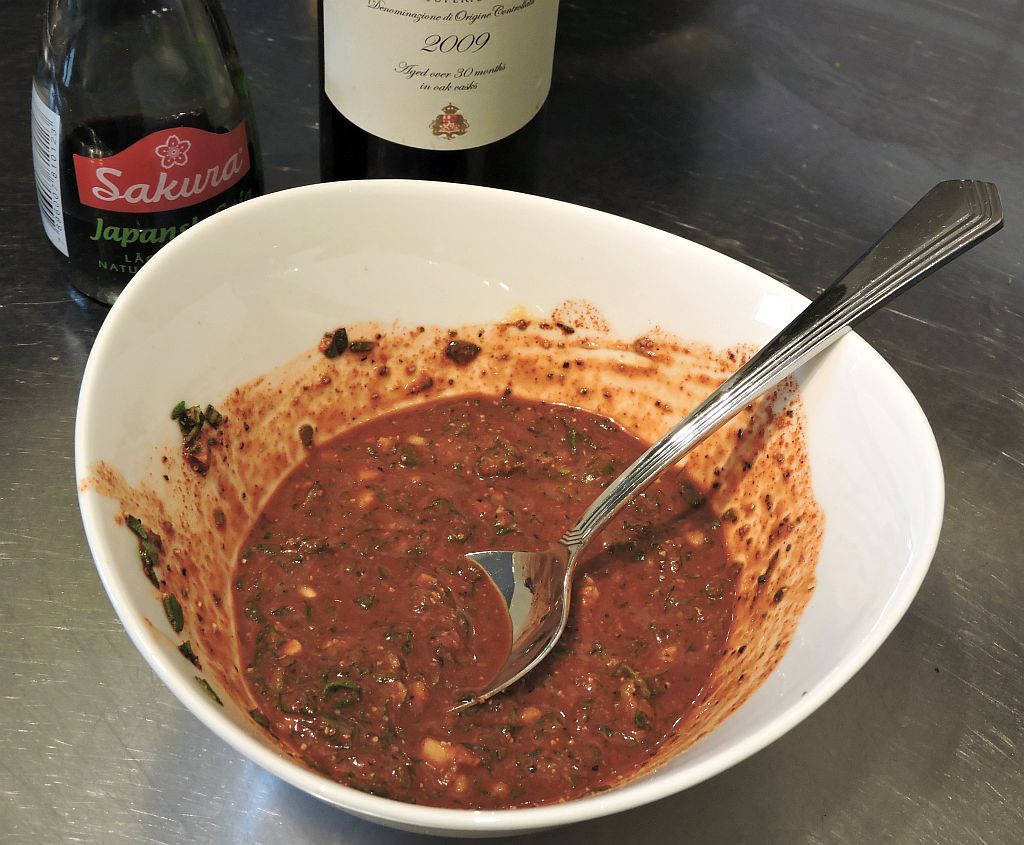 Tillsätt svartpeppar och paprikapulver och rör om. Tillsätt senap, soja och Marsala-vin. Blanda väl och späd sedan med rapsoljan under omrörning.