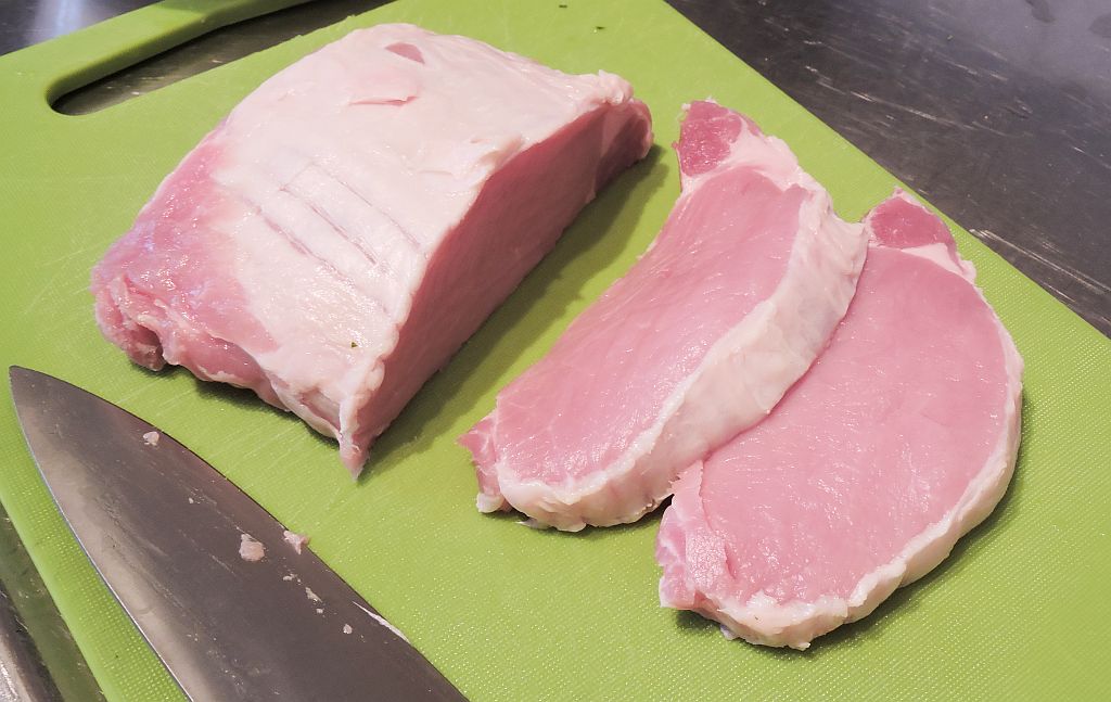 Skär kotletten i 2 centimeter tjocka skivor. Vill du så kan du sedan skära bort eventuellt fett (men om du ska grilla eller steka kotletterna bör du låta det vara kvar annars blir kotletterna för torra).