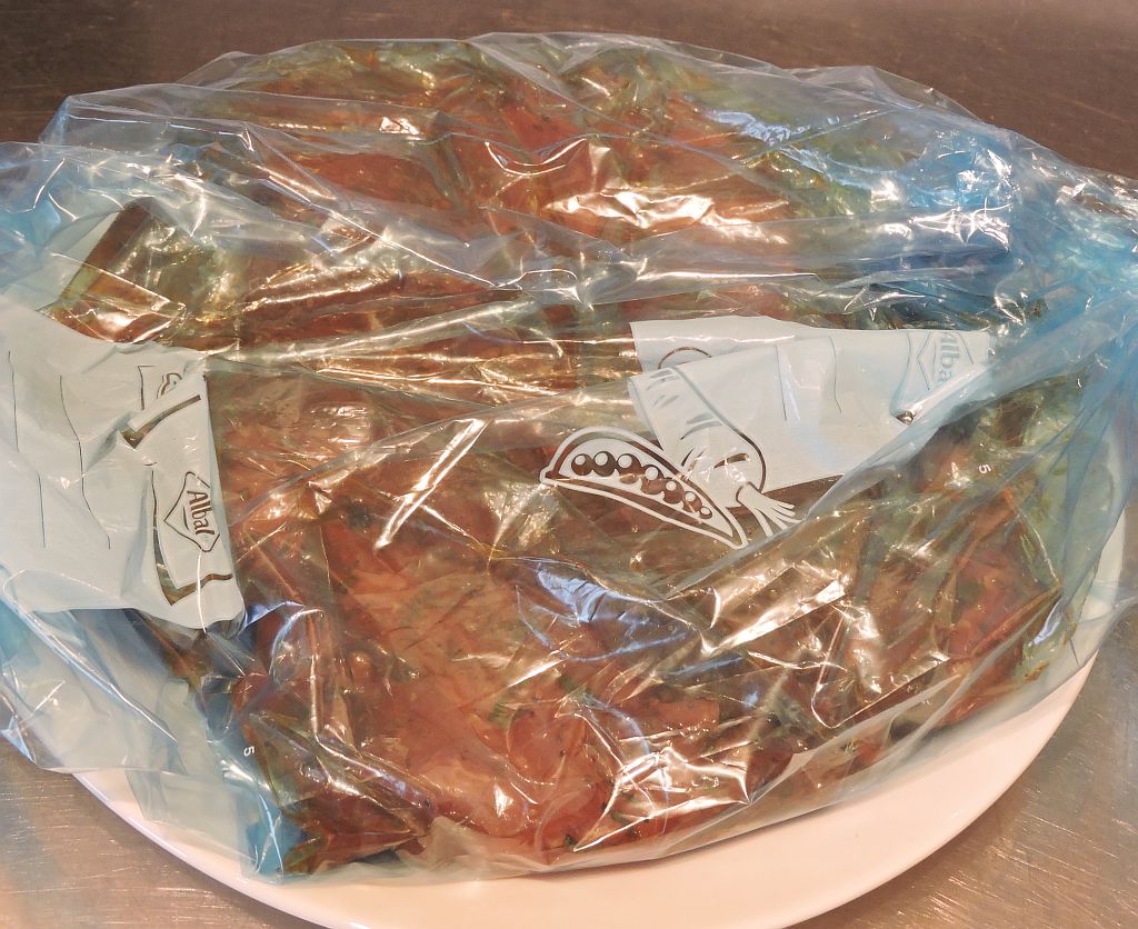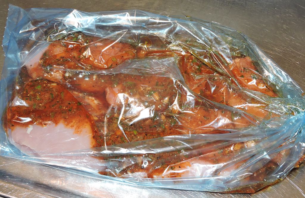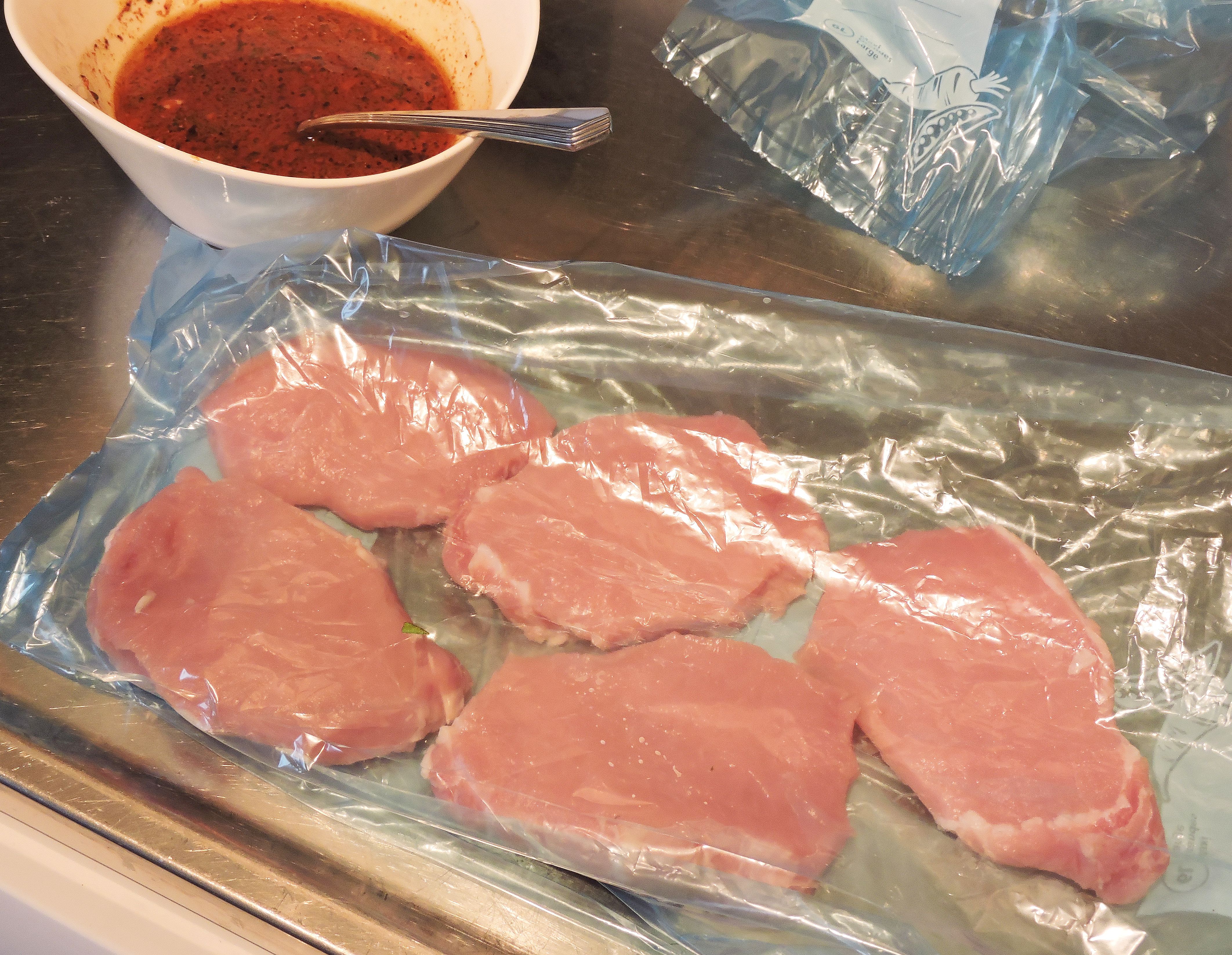 Häll marinaden i påsen med kotletterna, pressa ut så mycket luft det går utan att det skvätter marinad över halva köket och knyt sedan till påsen ordentligt. Lägg påsen i ytterligare en påse och knyt till.