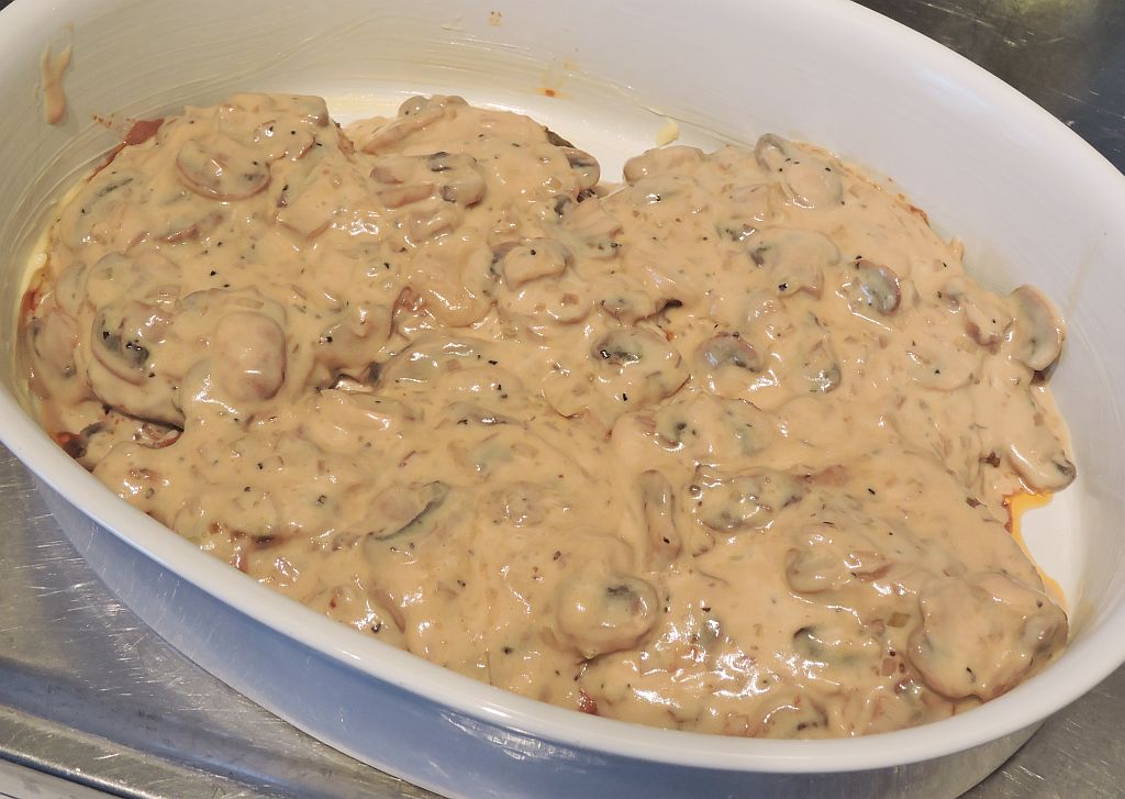 Häll svampsåsen över fläskkotletterna. Försök se till så det mesta av kotletterna får sås över sig.