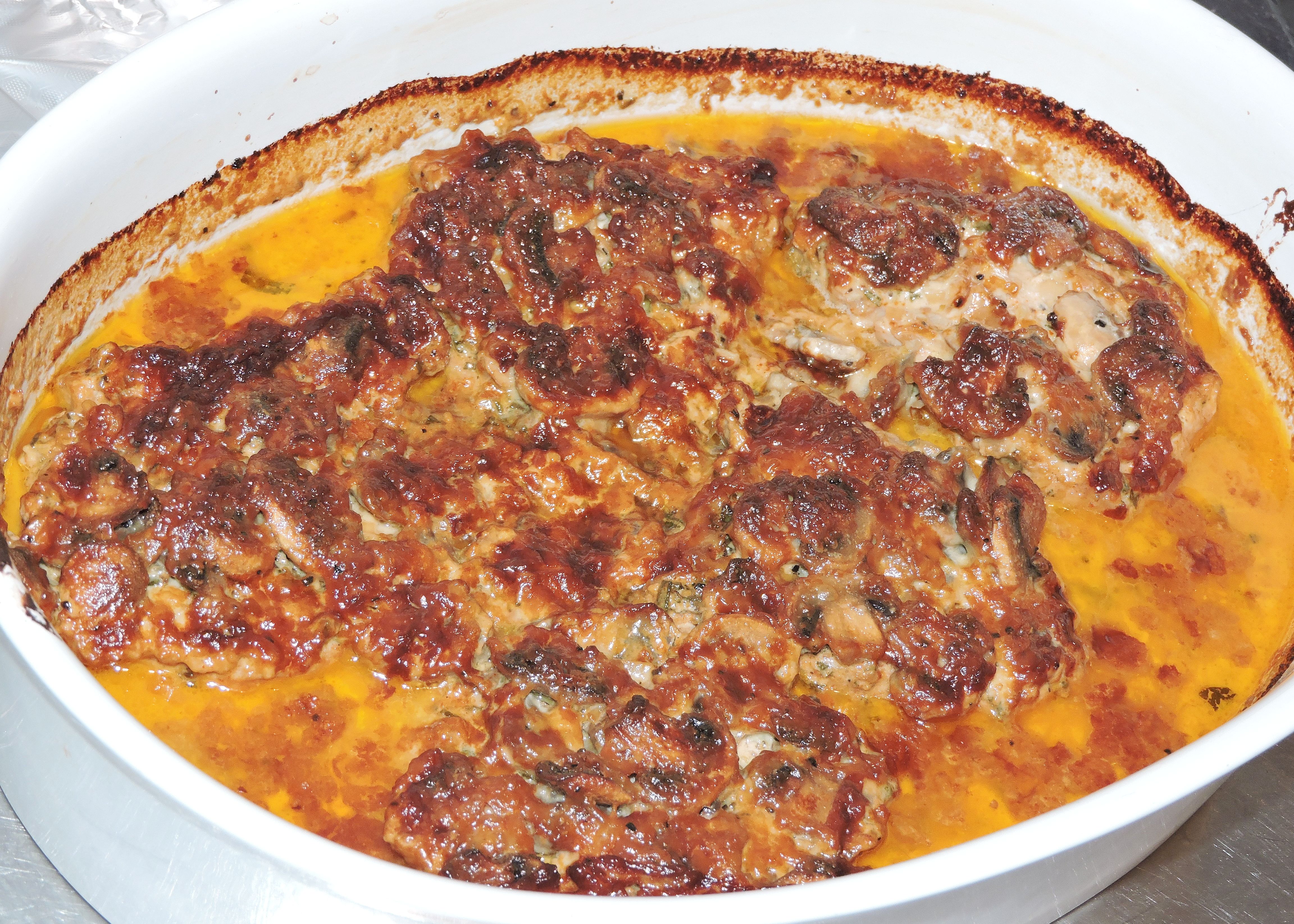 Ställ formen i mitten av ugnen och tillaga i 60 minuter. Skär i den tjockaste kotletten för att kontrollera att den är färdig – om inte så ställ tillbaka formen i ugnen i ytterligare 10-15 minuter.