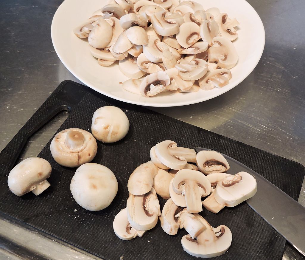 Rensa svampen och skiva den grovt. Är svamparna stora kan du halvera dem innan du skär dem i skivor. Här använder jag champinjoner, för det är enkelt att få tag i och passar bra till fläskkotlett. Men du kan förstås använda någon annan svamp om du vill det.