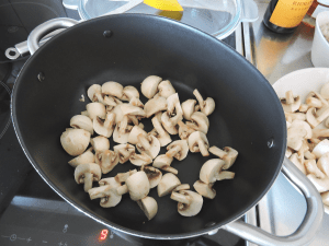 Hetta upp en stekgryta och torrstek champinjonerna hastigt. Lägg dem sedan i ett durkslag att rinna av.