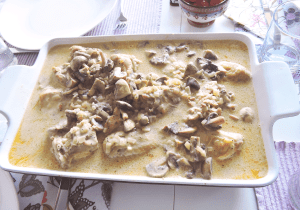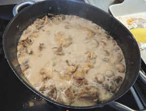 När du tycker såsen är färdig så lägg i champinjonerna och rör om. Nu kan du antingen lägga tillbaka kycklingen i grytan och servera den så. De är praktiskt om du vill hålla den varm en stund.