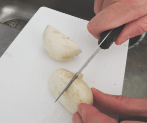 Rensa champinjonerna. Är de riktigt små (så kallade knapp-champinjoner) kan du låta dem vara hela. Annars dela eller kvadrera dem.