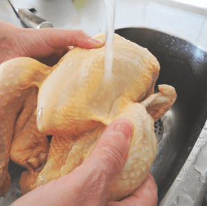 Tvätta noga dina händer och diska alla redskap som har kommit i kontakt med den råa kycklingen.