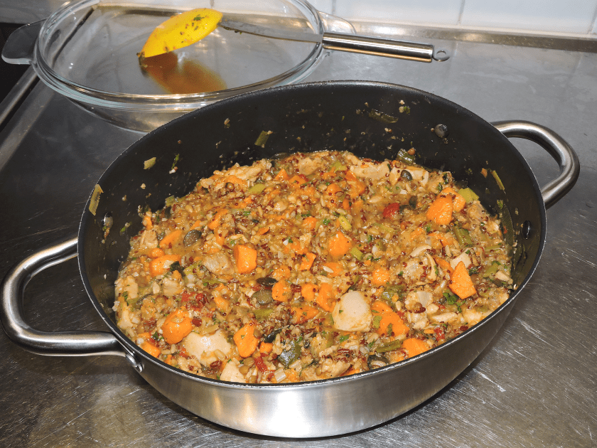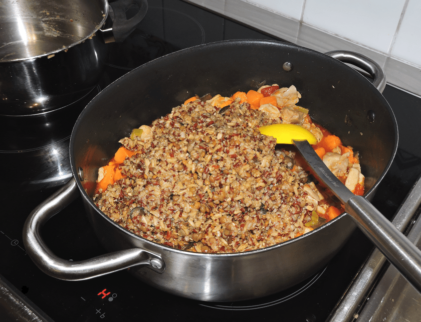 Det är ett relativt nyttigt recept, beroende på vilken sorts ris du väljer. Jag valde Paulúns supermix med rött råris, gröna linser, quinoa, brunt råris och pumpafrön. Det blev otroligt gott i den här rätten.