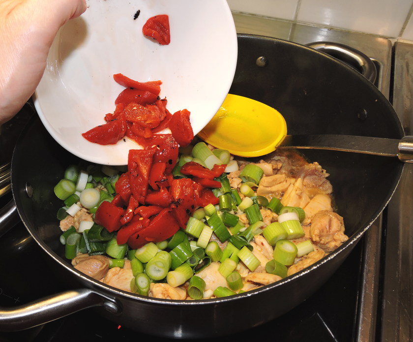 Häll i salladslök, paprika och sötpotatis i grytan tillsammans med en nypa salt och citronpeppar.