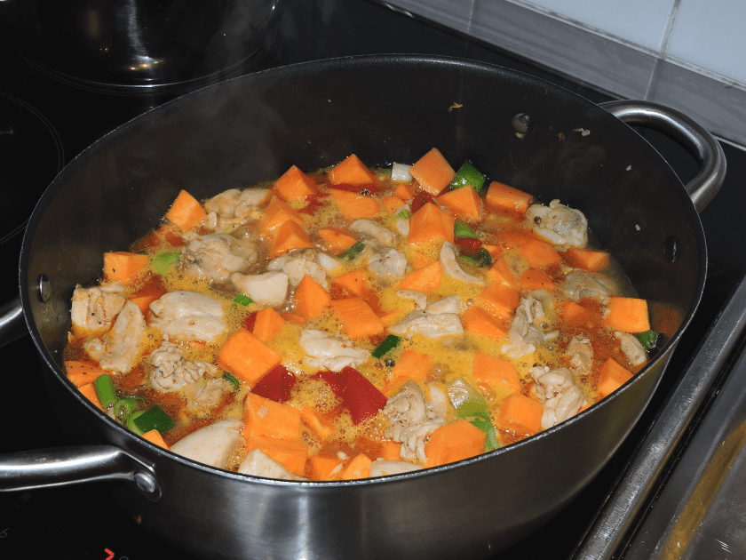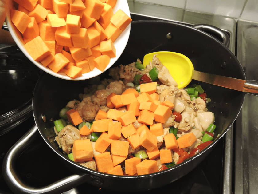 Rör om och lägg på locket. Låt puttra ihop på medelvärme tills sötpotatisen börjar bli mjuk, cirka 10-15 minuter.