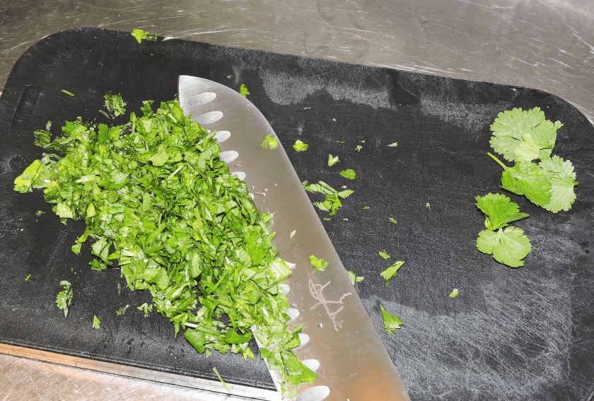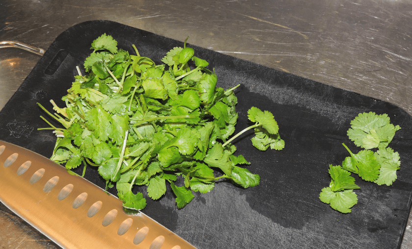 Skölj koriandern och krama den torr med hushållspapper. Hacka stjälkarna fint och bladen i lite större bitar.